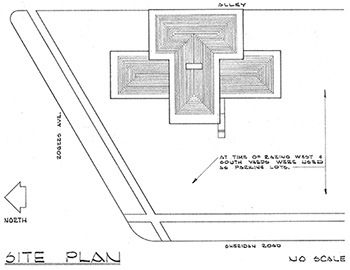 Description: Sheet 1, Site Plan 1963. In April 1963, just before the destruction of the Steffens Residence, architects R. Gardner and J. William Rudd recorded precise measurements for the National Park Service. These drawings, completed on April 4, 1964, along with the written description completed in September 1966, leave an invaluable record of the Oscar Steffens Residence.