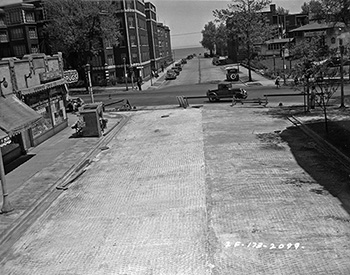 Most likely photographed around 1940 on a warm Winter or Spring day. Snow is melting and and clientele for the local apartment complexes are plentiful. Sandy Goldman, reminiscing about the Rogers Park Community wrote, the "...King’s Arms restaurant (great food; great bar) stood on a hill at the S.E corner..."
