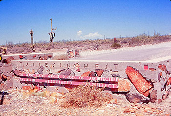right side. Imprinted in concrete: "Taliesin West." Wooden addition: