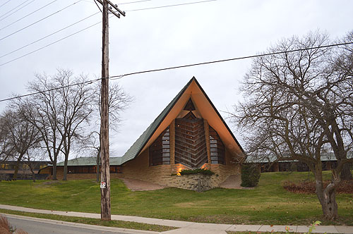 Designed in 1947, construction began in 1949. On August 21, 1951, the church opened with a lecture by Frank Lloyd Wright and a performance by the Taliesin Fellowship musicians. In 1960, the American Institute of Architects designated it as one of 17 examples of Wright's contribution to American culture. It was placed on the National Register of Historic Places in 1973. "...I tried to build a building here that expressed that over-all sense of unity. The plan you see is triangular. The roof is triangular and out of this – triangulation – (aspiration) you get this expression of reverence without recourse to the steeple.