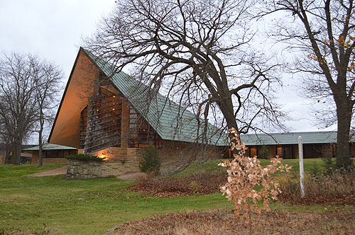"In this design, the social activities of the members of the congregation are served by the Church Auditorium itself. In front of the Auditorium, beautiful views of distant Lake Mendota frame the pulpit on either side. The preacher and the choir are at this apex of the main triangle. The whole triangle is the center of the plan, and the apex of the triangle is a stone mass of perforated pattern... It is the mass of the structure that is depended upon to give the impression of aspiration usually left to the steeple. The walls are to be made of native stone, the interior framing wood, and the roofs copper..." Frank Lloyd Wright, Architectural Forum, January, 1948.