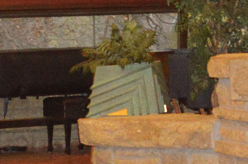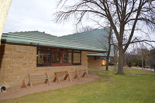 The low wall near the Entrance appears to have been shortened in length from the original plans. The red tile, signed "FLLW" indicated Frank Lloyd Wright's seal of approval.