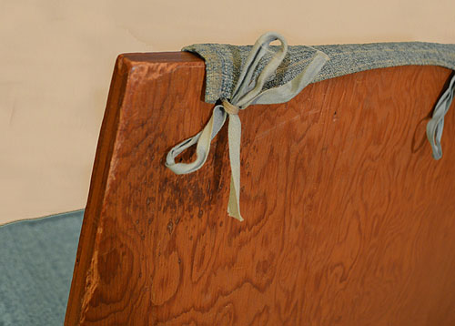 1) First Unitarian Society - Unitarian Meeting House, Pew/Benches 1951. Component parts, sized to allow for full use of 4’ x 8’ sheets of plywood, were precut at Taliesin and assembled at the Meeting House by apprentices working under Wright’s direction in 1951. (S#0857.29.0917-1) 2) First Unitarian Society - Unitarian Meeting House, Pew/Benches 1951. Chains were used to hold the back of the pew at just the right angle. They were assembled at the Meeting House by apprentices working under Wright’s direction in 1951. (S#0857.29.0917-2) 3) First Unitarian Society - Unitarian Meeting House, Pew/Benches 1951. Front view of the Pew. For each regular double bench the original design used two, single seat cushions, made of denim-like, aqua blue fabric. That fabric did not wear well and also faded. A later version used a single, much thinner cushion of foam rubber covered with a longer wearing, textured, aqua blue fabric. (S#0857.29.0917-3) 4) First Unitarian Society - Unitarian Meeting House, Pew/Benches 1951. Side view of the Pew. Chains were used to hold the back of the pew at just the right angle. Component parts, sized to allow for full use of 4’ x 8’ sheets of 3/4" plywood, were precut at Taliesin and assembled at the Meeting House by apprentices working under Wright’s direction in 1951. (S#0857.29.0917-4) 5) First Unitarian Society - Unitarian Meeting House, Pew/Benches 1951. View of the back of the Pew. The original covering included a flap of fabric over the bench seat back which formed a pocket for books. Holes were drilled in each bench to accommodate string ties. (S#0857.29.0917-5) 6) First Unitarian Society - Unitarian Meeting House, Pew/Benches 1951. Detail of the legs constructed of 3/4" plywood. (S#0857.29.0917-6) 7) First Unitarian Society - Unitarian Meeting House, Pew/Benches 1951. Chains are securred by a figure eight pin. (S#0857.29.0917-7) 8) First Unitarian Society - Unitarian Meeting House, Pew/Benches 1951. The original covering included a flap of fabric over the bench seat back which formed a pocket for books. (S#0857.29.0917-8) 9) First Unitarian Society - Unitarian Meeting House, Pew/Benches 1951. View of the back of the Pew. Holes were drilled in each bench to accommodate string ties. The original covering included a flap of fabric over the bench seat back which formed a pocket for books. (S#0857.29.0917-9) 10) First Unitarian Society - Unitarian Meeting House, Pew/Benches 1951. Three hinges allow the back to fold flat, allowing for storage. (S#0857.29.0917-10) 11) First Unitarian Society - Unitarian Meeting House, Pew/Benches 1951. View without cushions. Component parts, sized to allow for full use of 4’ x 8’ sheets of plywood, were precut at Taliesin and assembled at the Meeting House by apprentices working under Wright’s direction in 1951. (S#0857.29.0917-11) 12) First Unitarian Society - Unitarian Meeting House, Pew/Benches 1951. Detail of the leg construction. Each bench is branded with Frank Lloyd Wright's initials and the Unitarian Meeting House Icon "(Icon) FLW 51." (S#0857.29.0917-12) 13) First Unitarian Society - Unitarian Meeting House, Pew/Benches 1951. Each bench is branded with Frank Lloyd Wright's initials and the Unitarian Meeting House Icon "(Icon) FLW 51."