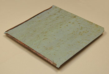 Description: Designed in 1947, construction began in 1949. On August 21, 1951, the church opened with a lecture by Frank Lloyd Wright. The roof and fascia are finished in copper. "The distinctive roof rising to a height of nearly forty feet above the central gathering space, or Auditorium, is sheathed in seamed copper and is ‘composed of origami-like folded copper clad planes.’ The projecting ribs run horizontally across the roof rather than vertically, except where they follow the 60-degree angle of the gable over the prow, and serve a decorative rather than functional purpose... As a roofing material, copper appealed to Wright as a building element with integral color, especially once its patina has developed, and for the ease with which it could be manipulated to give greater emphasis to angles through the placement of battens... Likely intended as a cost saving measure, a 14-ounce weight copper was specified when the 15,500 square foot roof was installed... In 1994, the society undertook a major roof project involving the structural reinforcement of three trusses and the replacement of 7,000 square feet of heavier gauge copper roofing. As part of this project, the copper sheathing was removed from the entire upper roof and entrance areas and the trusses in those areas straightened and stiffened with steel and 16-ounce gauge copper installed. The impetus behind this project occurred in the winter of 1992-93, when the leaks and moisture problems at the Meeting House became especially severe..." National Historic Landmark Nomination, First Unitarian Society Meeting House, 2004. Original sheet of copper roof section for the Unitarian Meeting House, 1949, removed in 1994.