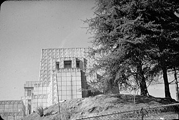 Description: Viewed from the East. The Master Bedroom and Terrace are in the foreground. The trees on the right are 20-30 year old fir tree. "Wright In Hollywood" Sweeney, 1994, p.88, show a photograph circa 1924-25, of that same view under construction. There are no trees in that spot. Most likely photographed during one of the renovations between 1940 to 1968. Stamped on face: "4." Verso: "Processed by Color Photo, Inc. Ektachrome Transparency." Not dated.
