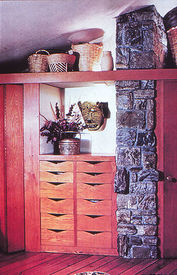 Description: Set of 9 - 35mm slides. Copy photograph from an article published in the American Art & Antiques, May-June 1979, p.66. View of the Friedman Residence Master Bedroom. Designed by Frank Lloyd Wright in 1948. Text on sleeve: "A/U.S./XX Cent. Wright, F.L. Pleasantville, N.Y.: Friedman House. Int: Closet. Late 1940s. Acquired from the archives of the University of Virginia. Two sets.