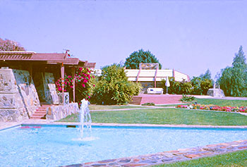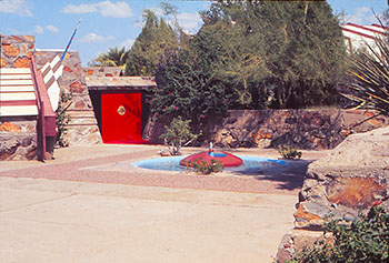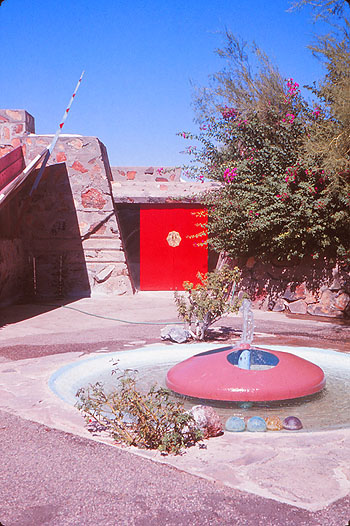 2) Taliesin West, Scottsdale, Arizona, Circa 1985 (1937 - S.241). Viewed from the South. Fountain in front on the Cabaret Theater. The Drafting Studio is in the background. Similar photograph published in Frank Lloyd Wright Selected Houses 3, Pfeiffer, 1989, p.102.