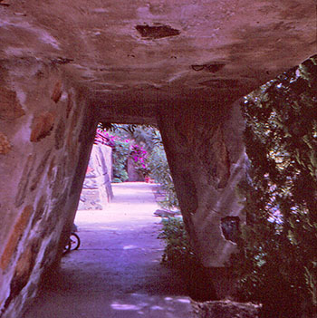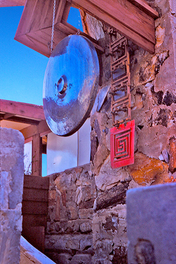 Description: 2) Not dated. Set of two 35 mm slides. View of the Bell Tower from the East. Stairs lead to the Upper Apartments. One of the twelve ceramic Chinese Theaters is embedded in the desert masonry wall at the base of the stairs. Note the horizontal piece of wood that intersects the two vertical pieces. It was modified at some point after 1969 (S#1803.26.0418 -12). Text on sleeve: "Mod: Arch: Am: Wright FL: Scottsdale, AZ: Res: Taliesin (West): Kitchen Tower From North (sic): 1938. Radforn. 94US-134/96. 071044." Stamped on sleeve: "Holy Cross." Acquired from the archives of the University of Virginia.
