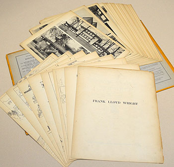 Plates are single sheets, printed one side only. Plates 1-25 include photographs of: Plate 1: Evans, Thomas. Plate 2: Larkin (2). Plate 3: Unity (2), New Theater (Barnsdall). Plate 4: Coonley, Steffens. Plate 5: Coonley (3). Plate 6: Coonley, Roberts, Barnsdall Res B. Plate 7: Robie, Heath. Plate 8: Coonley Playhouse, Heurtley. Plate 9: Allen (2 Ills). Plate 10: Taliesin (1911). Plate 11: Taliesin, Taliesin Dam. Plate 12: Taliesin Living Room. Plate 13: Taliesin (2). Plate 14: Midway Gardens (2). Plate 15: Midway Gardens (2). Plate 16: Imperial Hotel (3). Plate 17: Imperial Hotel (3). Plate 18: Imperial Hotel (2). Plate 19: Imperial Hotel (2). Plate 20: German, Plan (multiple dwellings), Press Building (model). Plate 21: Barnsdall (2), Ennis. Plate 22: Barnsdall (2). Plate 23: Barnsdall (4). Plate 24: Miniatura, Freeman. Plate 25: Midway Gardens, Sugarloaf Mountain (3 Ills), Unidentified (1), Romeo and Juliet.