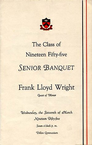 YEAR TITLE AUTHOR DESCRIPTION PAGES ST# 1955 The Class of 1955, Princeton University Senior Banquet Princeton University Program for the Princeton University Class of 1955, Senior Banquet on March 16, 1955, Dillon Gymnasium. Frank Lloyd Wright Guest of Honor. Address by Mr. Wright. (1st Edition) Pp 4 1060.01.0202
