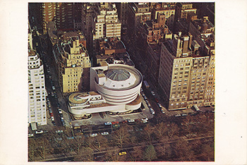 Description: Aerial view of the Guggenheim Museum. Part of a set of eight color post cards of the Guggenheim Museum. Designed by Frank Lloyd Wright in 1956. Aerial view of the Guggenheim Museum. Text on verso: “Museum, Aerial View From Northwest. The Solomon R. Guggenheim Museum, 1071 Fifth Ave., New York , N.Y. 10028.”