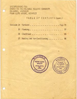 Title: Original Specifications: Church for the Milwaukee Hellenic Community.