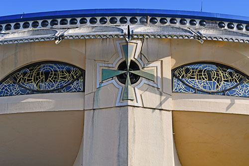 The roof and curved arch over the entrance were surfaced with blue mosaic tile. But because the roof had issues with leaking, it was resurfaced. The arched entrance however retained the blue mosaic tile.