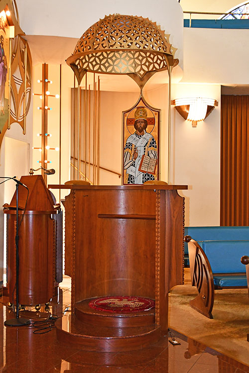 Stain glass windows are incorporated throughout the church and are a dominate feature. Semi-circular windows surround thecircumference of the dome. There are windows at the entrance and also the narthex (foyer). Seating fills the lower level. Three circular stairways, lead up to the balcony level which is filled with additional seating. as well as down to the lower level. Light poles, set within the circular stairways reach from the lower lever through the main level to the ceiling of the upper level. The Chancel (platform) reaches nearly to the center of the auditorium. Behind the pulpit is an ornately decorated screen with religious symbols. The screen encloses the alter and the alter area.