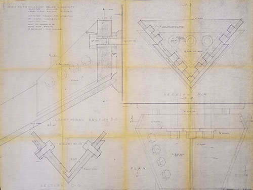 Description: Original blueprint for the Structural Balcony Plan and Details dated September 1, 1958, Stamped: Revised November 10, 1958. Details include Stair Reinforcement, Plan of Shell Roof Over Narthex, Sections and Typical Balcony Reinforcement. Lower text: “Church for The Milwaukee Hellenic Community. Milwaukee, Wisconsin. Frank Lloyd Wright, Architect. Structural Balcony Plan and Details. Sheet 14.” Within Square: “FLLW, Sept 1, 58.” Stamped under square: “Revision Nov 10, 1958.” Providence: The Estate of James Mahos, one of the building committee member for the Annunciation Greek Orthodox Church. See additional details...