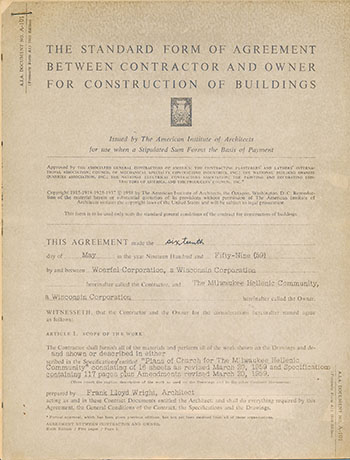 Title: Annunciation Greek Orthodox Church, Milwaukee, Wisconsin, Contract, 1959 (1956 - S.399).