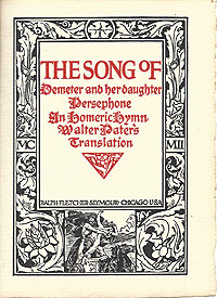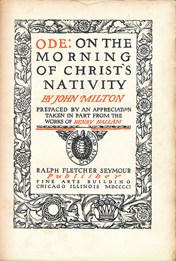 Ralph Fletcher Seymour (March 18, 1876 - January 1, 1966). While working for the J. Manz Engraving Company, Ralph Fletcher Seymour began designing and publishing his own books in his spare time. The first book Seymour produced on his own was completed in 1897, featuring John Keats' "Ode to Melancholy". He hand-lettered the text and designed the small book to imitate old wood block books. His second was "Three Merry Old Tales" 1898, based on "Shakespeare Jest Book". In some respects, Three Merry Old Tales was Seymour's first book published for commercial distribution. For his third, he chose Browning's "Sonnets from the Portuguese." 1899. In 1900 he took over space in the Fine Arts Building from Charles Francis Browne. In October 1900 he published his fourth book, "The Eve of St. Agnes", by John Keats. Illustrated and lettered by hand, and printed in two colors. This volume included six illustrations by Seymour plus one customized illustration accompanied by his signature. Frank Lloyd Wright worked with Seymour in 1911 after his return from Europe. Seymour published "The Morality of Woman and Other Essays" Key, "Love and Ethics" Key, 1912, and "The Torpedo under the Ark" also by Key in 1912. That same year he also published Wright's "The Japanese Print: An Interpretation". He continued publishing books until his death when he was hit by a car walking home early morning New Year's Day 1966, at the age of 89. For additional information concerning Seymour work, see the "Caxtonian" May 2011.