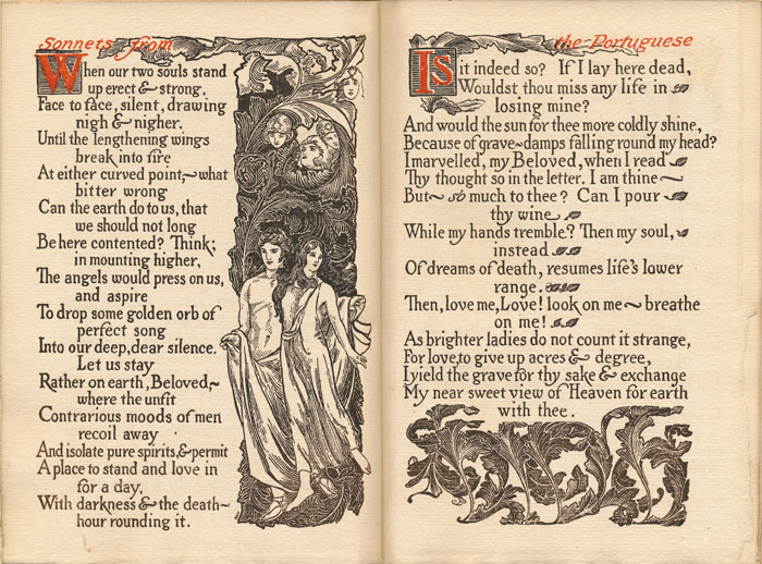 Title Page Spread: Sonnets from the Portuguese. With an introduction by Frank W. Gunsaulus. Published by Ralph Fletcher Seymour, Chicago. Illustration above title sign with overlapping "RFS." Illustrated by Ralph Fletcher Seymour.