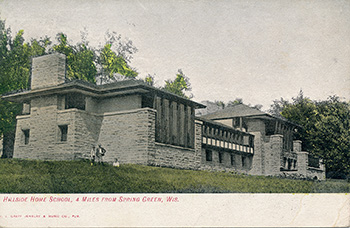 Description: Front: “Hillside Home School, 4 Miles From Spring Green, Wis.” (Published by W. J. Graff Jewelry & Music Co., Pub.) View from the Southwest. Three students can be seen in front of the building. Ellen (Nell) and Jane Lloyd Jones, Frank Lloyd Wright’s aunts, formed the Hillside Home School in 1887 and ran it until 1915 when it closed. After attending the University of Wisconsin, Madison, Wright headed for Chicago in 1887 and accepted a position as draftsman in the architectural firm of Joseph Lyman Silsbee. That year, his Aunt’s drafted him to design a school building for them... Continue...