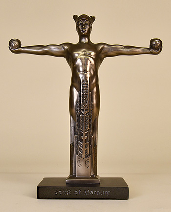 Label affixed to base: “The Spirit of Mercury.” Reproduction of Richard Bock’s design for Frank Lloyd Wright’s City National Bank, 1910.