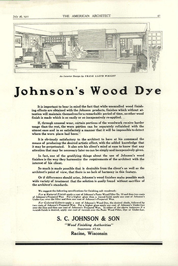 Ad text: “Johnson’s Wood Dye. It is important to bear in mind the fact that while unexcelled wood finishing effects are obtained with the Johnson products, finishes which without attention will maintain themselves for a remarkable period of time, no other wood finish is made which is so easily or so inexpensively re-applied...” Digital edition.