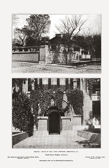 Description: Three plates of the Susan Laurence Dana House (1902 - S.072), were published in the August 24, 1907 issue. A) View from the East. Text on face: "House of Mrs. Mary Lawrence, Springfield, Ill. Frank Lloyd Wright Architect. Copyright 1907, by the Swetland Publishing Co. The American Architect and Building News. Regular Edition. Volume XCII., Number 1652. August 24, 1907. (Photographic reproduction.) B) View from the Southeast. Text on face: "Studio of of Mrs. Mary Lawrence, Springfield, Ill. Frank Lloyd Wright Architect. Copyright 1907, by the Swetland Publishing Co. The American Architect and Building News. Regular Edition. Volume XCII., Number 1652. August 24, 1907. (Printed plate from publication. Printed one side only.) C) Upper: View from the Southwest. Lower: View of the entrance. Text on face: "Details: House of Mrs. Mary Lawrence, Springfield, Ill. Frank Lloyd Wright Architect. Copyright 1907, by the Swetland Publishing Co. The American Architect and Building News. Regular Edition. Volume XCII., Number 1652. August 24, 1907. (Photographic reproduction.) (Sweeney 69)