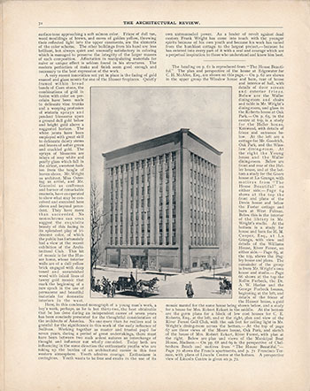 Description: "A Great Exhibition. We have seen the announcement in the papers of an architectural exhibition at Pittsburgh; we may have heard someone speak about it; we have, perhaps, been fortunate enough to see the catalogue... Whether it be in the charmingly imaginative and decorative treatment used by the father of this modern movement. Louis H. Sullivan, or in the most decorative. somewhat Japanese handling of F. L. Wright, or in the severer work along similar lines of Dean & Dean... It is unfortunate that Louis H. Sullivan is represented by only one exhibit, a plaster model of a beautiful capital, but that alone is sufficient to show his wonderful creative force and mastery of detail. We could not in any exhibition pass by the most decorative presentations of Frank Lloyd Wright without stopping to study them, with their happy contrasts of big wall surfaces and well-placed and pros portioned voids and ornament. How well the house nestles into its setting of gardens, lawns, trees and shrubs. How the hanging vines from window boxes add the one note of color necessary to break the monotony of the big surfaces and tie them into their setting. What a home-like and cozy feeling is evolved by the use of big simple roofs, as in the house for F. W. Little at Peoria, or by the happy grouping of broad horizontal lines as in the house for Mr. Coonley at Riverside, Ill., or that for Mr. Show at Montreal, Canada, or by the exceptionally artistic grouping of windows in the house for Mr. Hardy at Racine, Wis. Yes, among these twelve drawings there is a predominant sentiment of hominess, of livableness..." (Digital copy of magazine. Captions for four illustrations: A) Unity Church, Oak Park, Ill., Frank Lloyd Wright Architect; B) Dwelling for F. W. Little, Peoria, Ill., Frank Lloyd Wright Architect; C) Dwelling for Thomas Paul Hardy, Racine, Wis. Frank Lloyd Wright Architect; D) Swelling for Mrs. Mary M. W. Adams, Highland Park, Ill. Frank Lloyd Wright Architect. The Pittsburgh Architectural Club's Exhibition. The American Architect and Building News. Regular Edition. Volume XCII., Number 1666. November 30, 1907. Digital edition. See Catalog. (Photographic reproduction.) (Sweeney 74)