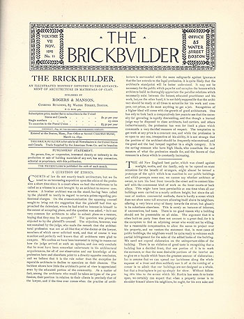 "This booklet was designed to meet the demand for a practical discussion of the various forms of concrete construction as applied to residences. It contains illustrations, descriptions and statements of cost of nearly one hundred cement houses of different types, built in all parts of the country. Special chapters are devoted to decorative design for interiors and the production of attractive exterior surface finishes. A copy will be sent to any address upon receipt of fifty cents. Address the nearest office of the Company." The illustration show the cover of the booklet and one spread. The left hand side of the spread is a photograph of the Edmund Brigham Residence.