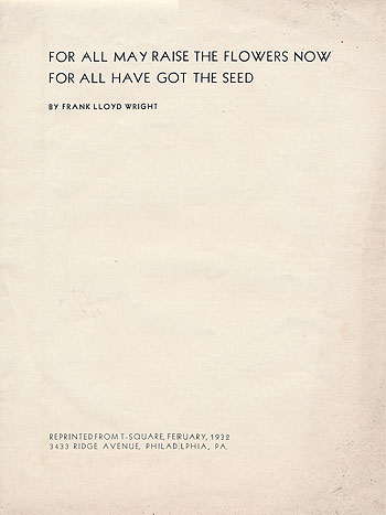 Description: "For All May Rise the Flowers Now, For All Have Got the Seed. Is architecture "modern" because alter-ego need some formula to follow any individual initiative and over taking it, as they imagine, may thus manage soon to ride the initiative to death? How much is being written and how little built and how little sense in cause or contra shows clearly why the straight-line and flat-plane (both abstractions), and the single curved-surface added to make of the whole another abstraction, have come to be expedient "modern" architecture...." Also reprinted in "USA Tomorrow," January 1955 (S#1090). (Sweeney 353)