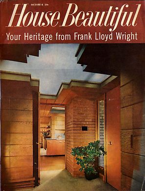 The Love Affair of a Man and His House. This story of what a modern house means to its owner came to house beautiful unsolicited. We held it for more than a year before we decided to be brave enough to publish it. We say brave because it will make a lot of our readers very angry. But since it is true that the house is so much more then a shelter, we think people ought to know about it. (Pope:) For six years we lived in a truly modern house, designed and built for us by Frank Lloyd Wright, the worlds greatest Architect and one of its greatest man. And because there are many people to whom honest, organic architecture is and uncertain venture, we want to tell what it has meant to us. What we have found is this: it is the only kind of house fit for man to live in. It is not expensive. It is the best kind of home investment. It is far and away the most practical. It is the only kind that has anything to offer the spirit and finally, the lending public is way behind the buying public in its standard judgment of what kind of house is desirable in valuable... Includes four photographs of the Pope Residence. Original cover price $1.