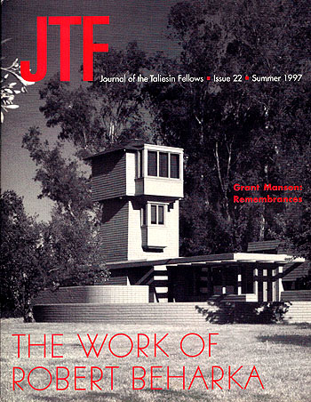 Description: 1) Taliesin Preservation Inc. Completes Restoration at Spring Green. 2) From the President’s Desk. 3) Passing. Richard P. Miller, 1931-2004. 4) Taliesin West Sets October Celebration. 5) The Architecture of H. Paterson Fletcher. 6) Reminiscence of Taliesin. 7) Arthur Dyson Designs. Fresno Woodward Park Regional Library. 8) Books Reviews. "Usonia, New York". "Wrightscapes". Includes 30 photographs and three illustration. Original price $12.50. Gift from Gerald Klitz.