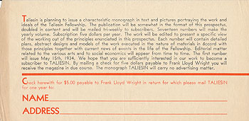 Subscription Blank. "TALIESIN" publication six times a year by the Taliesin Fellowship, edited by Frank Lloyd Wright. Subscription price Three Dollars and a half for the six issues as herein outlined, sent flat. Single copies, seventy five cents each. In order to subscribe tear off this blank and send it with check to the Secretary of the Taliesin Fellowship, Spring Green, Wisconsin. This layout was used again for The Taliesin Fellowship Playhouse Program, 1940, S#2040.01.