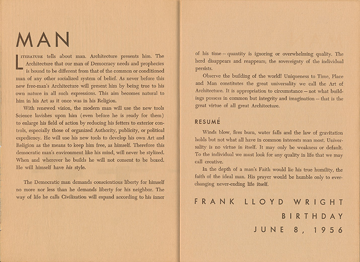 Description: Facsimile of 1933 Version by Taliesin Fellowship, Taliesin West. One difference is that this does not have the address flap for mailing. Includes mailing envelope.