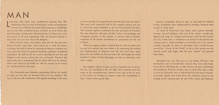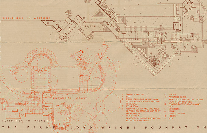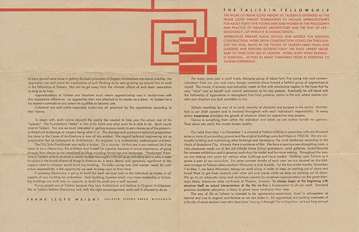 Description: A broadside describing Taliesin, the Taliesin Fellowship, the Taliesin Playhouse and its programs, an invitation to visitors to tour the buildings and attend the Playhouse programs, a list of Wrights books for sale, an illustration of Taliesin and a map of the Taliesin Complex. "Taliesin. Taliesin is the name because in Welsh tradition the word ‘Taliesin’ means ‘shining brow’ and was the name of the only British bard ever to sing the glories of fine arts: a Welsh name because of the Welsh ancestry of its master architect and owner – the founder and leader of the Taliesin Fellowship – Frank Lloyd Wright. The Taliesin Fellowship was established in the fall of 1932. It is not at all a school. Its work is culture, not education, and there is not curriculum..." Printed in two color on one side of a single sheet, folded twice into quarters. (Sweeney 2039)