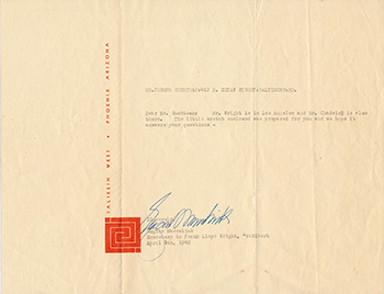 Title: Letter to William Dicus Bayley from Taliesin Fellowship. (Printed on Taliesin Fellowship letterhead. The design for the letterhead consisted of a horizontal line extending one-half inch past the fold. Two square dots, one past the end of the horizontal line, and one equally spaced below the end of it. Centered on the fold below is the Taliesin Fellowship logo, a variation of Frank Lloyd Wright red square. All printed in red. The logo was used throughout the first two prospectuses (S#2035 & 2036.) Printed on beige stock with the "Strathmore Envoy" watermark.)