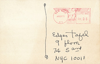 Description: Envelope addressed to Alfonso Iannelli, The Iannelli Studio, Park Ridge, Illinois. Envelope is formed by flap that wraps around the front. (Notice 1 1/2 cent stamp.) (First Edition) (Sweeney 2036)