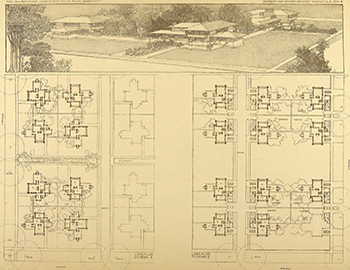 The perspective view shows the handling of the group at the centre of the block, with its foil of simple lawn, omitting the foliage of curb parkways to better show the scheme, retaining the same house in the four locations merely to afford an idea of the unity of the various elevations. In practice the houses would differ distinctly, though based upon a similar plan..." Includes seven illustrations of "A Home in a Prairie Town." Original cover price 10 cents. 11 x 16.5. (Sweeney 45)Size: 11 x 16.5