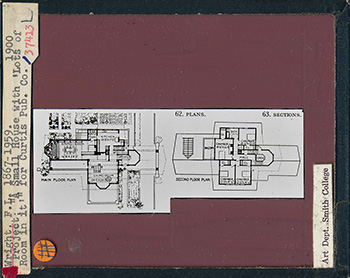 Text on face of slide: “Wright, F. L. , 1867-1959. 1900 (sic 1901). Project: A Small House with Lots of Room in it, for Curtis Pub. Co. 37413. Art Dept Smith College.” Acquired from the Art Department at Smith College.
