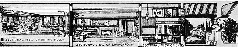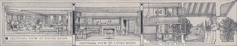Description: Copy photograph of the an illustration published in the Ladies Home Journal - July 1901 (Sweeney 46). A Small House with ‘Lots of Room in It.’ A full page article of a Prairie house designed by Frank Lloyd Wright. At the top of the page is a sectional view of the Dining Room, Living Room and Entry. Magic lantern slides were used in the U.S. during the late 1800s through the first half of the 1900s. Text: “Sectional View of the Dining Room. Sectional View of the Living Room. Sectional View of Entry.”