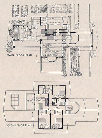 Although not an exact copy of the Bradley House (1900 - S.052). there are many similarities. To some degree, is a scaled down version of the Bradley House. Includes ten illustrations of A Small House with ‘Lots of Room in It.’ Original cover price 10 cents. 11 x 16.5. Two Copies. (Sweeney 46)Size: 11 x 16.5