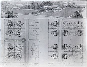 When Frank Lloyd Wright published Ausgefuhrte Bauten und Entwurfe in 1910, Plate XIII repeated the 1901 single home illustration, Plate XIIIa repeated the 1901 aerial view and elaborated his theory on the Block Plan. This slide is a copy of Plate XIIIa.