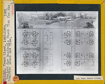 Text on face of slide: “Wright, Frank Lloyd, 1867-1959. 1901 (sic 1910). Project for Quadruple Block Plan for Prairie: plans and view. 87615. Art Dept Smith College.” Acquired from the Art Department at Smith College.