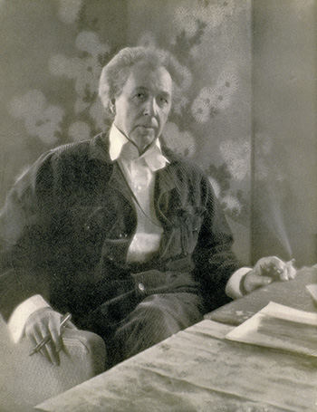 Wright in his living room at Taliesin. Seated at a table, a floral Japanese screen in the background. Pencil in his right hand, possibly a cigarette in his left. Part of a set of seven images to date photographed at the same time. Copy of portrait published in Town & Country, July 1937.